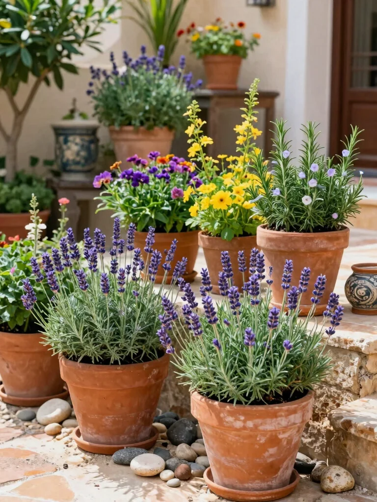Mediterranean Container Garden Terracotta Pots Fragrant herbs Use colorful pebbles