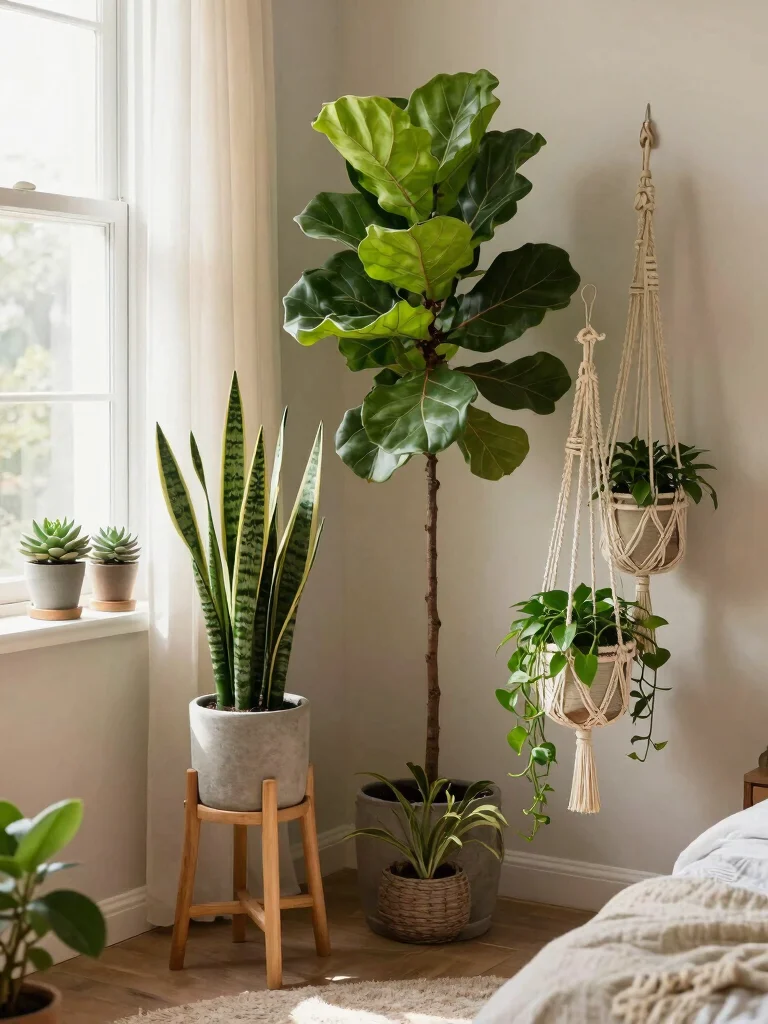 Incorporating greenery can transform your bedroom into a serene secret garden. A vibrant mix of tall floor plants, easy-care succulents, and cascading vines creates a lush atmosphere that feels alive. For instance, place a striking fiddle leaf fig in a corner and let trailing pothos hang from a shelf for visual interest.