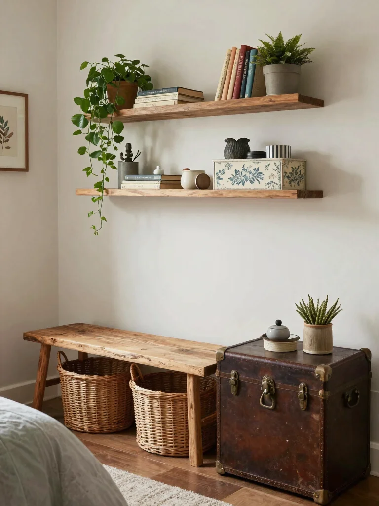 Floating shelves can serve dual purposes—displaying plants or decor while keeping clutter at bay. Consider under-bed storage bins styled to match your theme, ensuring easy access to your essentials.