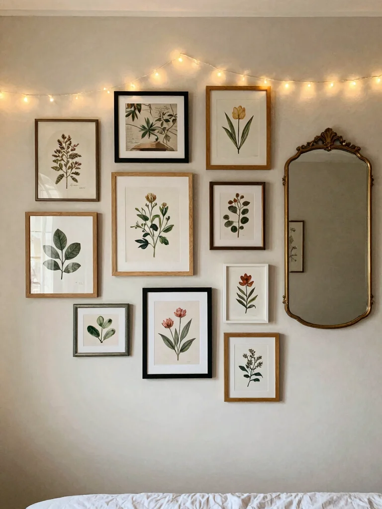 Infuse your bedroom with personality through whimsical wall art that aligns with your secret garden aesthetic. Consider a gallery wall of botanical prints, vintage floral illustrations, or framed pressed flowers to create an eye-catching focal point. Mixing frames of different styles and sizes adds a curated touch that feels personal.