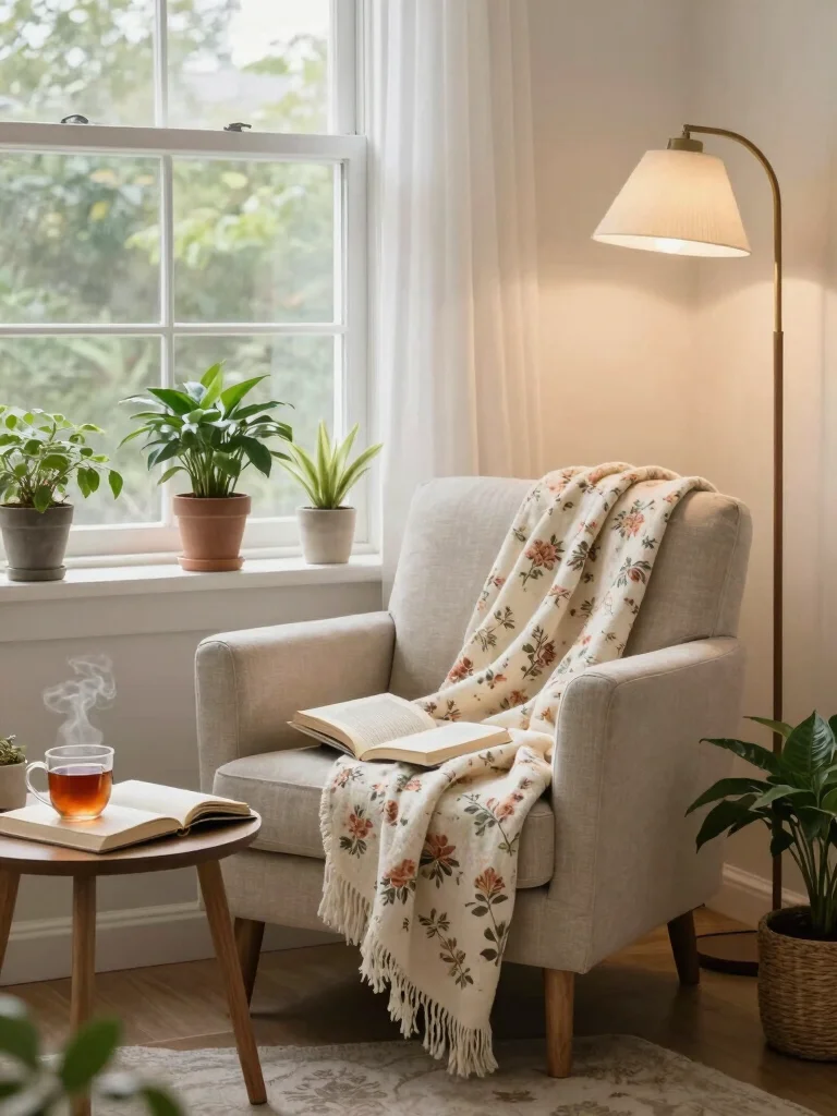 Create a sanctuary with a comfy reading nook, natural fabrics (linen, cotton), and a clutter-free layout.