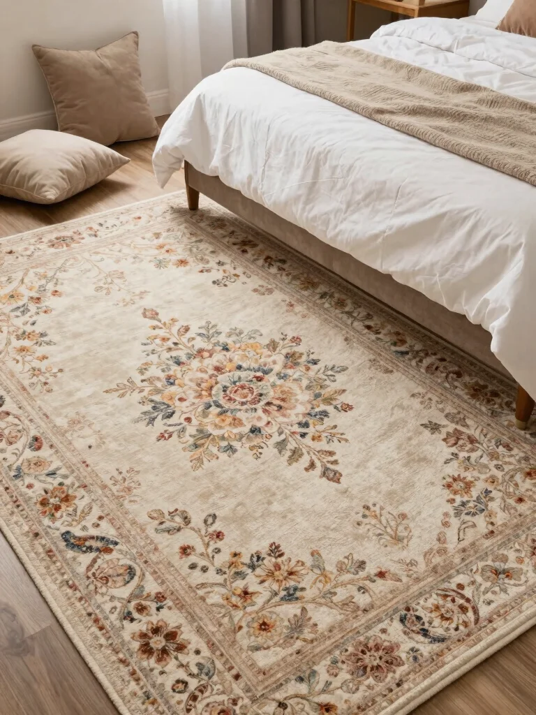 Rugs are essential for grounding your bedroom decor while adding warmth and comfort. Opt for soft, plush rugs made from natural fibers or floral patterns that create a cozy feeling underfoot. A beautiful area rug can help define spaces such as your bed, reading nook, or desk area.