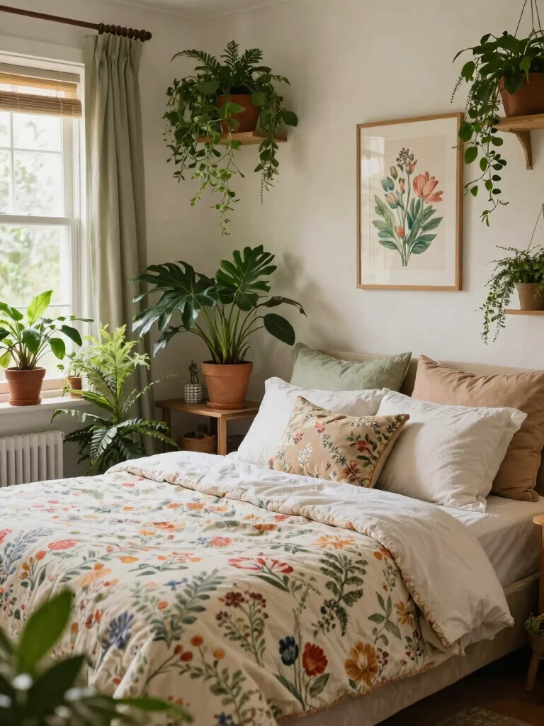 Stick to a cohesive palette of greens, creams, and soft neutrals to support floral bedroom aesthetics while avoiding visual chaos.