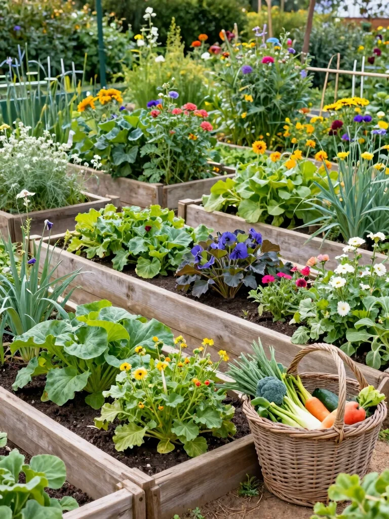 2. Mix vegetables, herbs, and flowers in each bed for a stunning display.