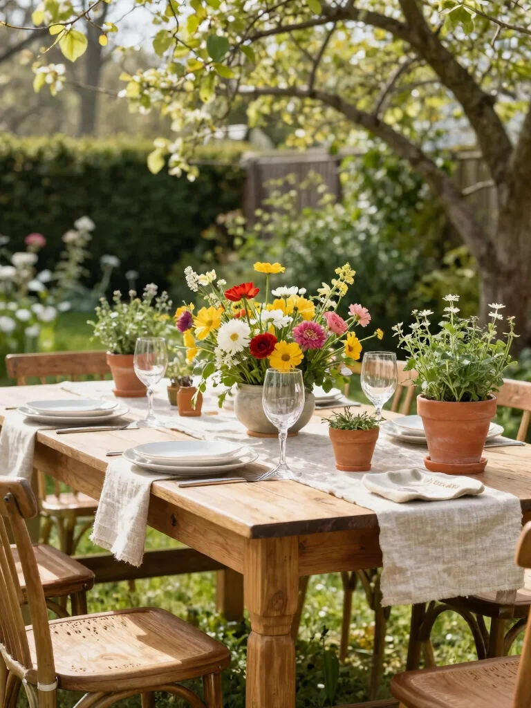 Mix and match plates and cutlery for an eclectic yet charming look. Consider using terracotta pots filled with herbs as centerpieces, providing guests with a delightful take-home gift that they can nurture long after the party ends.