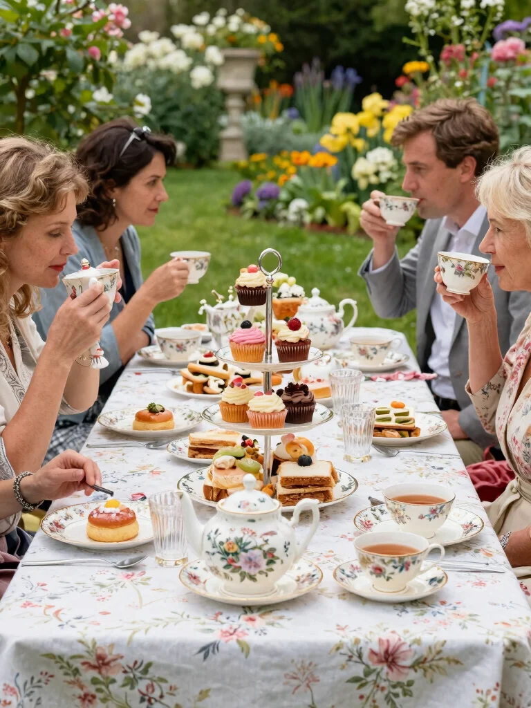 Set a long table adorned with floral tablecloths, offering a variety of teas and delicious finger foods. Delight your guests with an assortment of pastries, sandwiches, and scones to ensure a satisfying afternoon treat.
