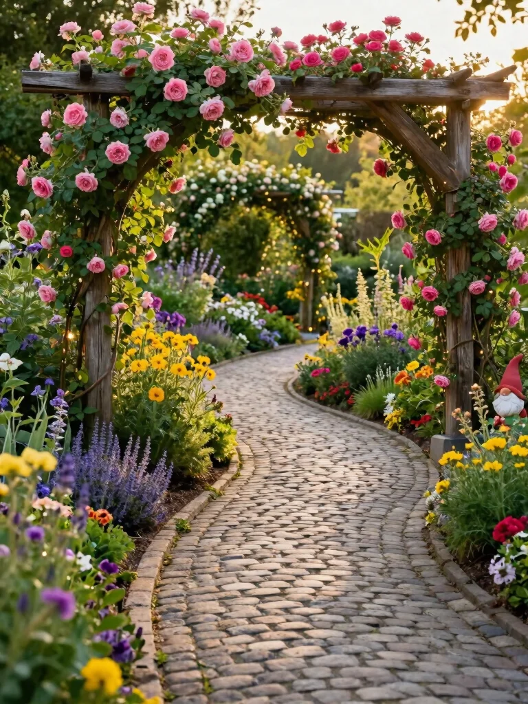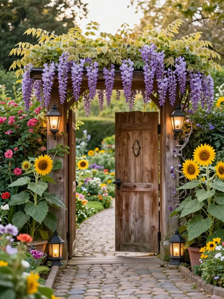 Use rustic gates adorned with intricate metalwork or weathered wood, flanked by lush flowering shrubs. Consider planting tall grasses or sunflowers on either side to foster a sense of privacy and enchantment. To maintain whimsy, add quirky sculptures or lanterns along the path, surprising visitors as they enter.