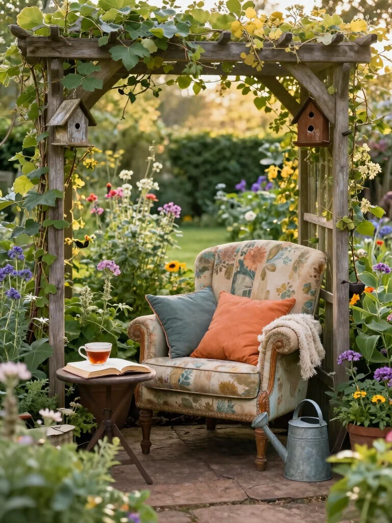 Transform your garden into a peaceful retreat with a cozy nook designed for relaxation and reflection. Picture a charming corner featuring a soft, weathered armchair nestled beneath a leafy arbor, surrounded by colorful cushions and a small table. This whimsical garden design creates a personal sanctuary amidst nature. Enrich the space with fragrant herbs and blooming flowers to attract butterflies and bees.