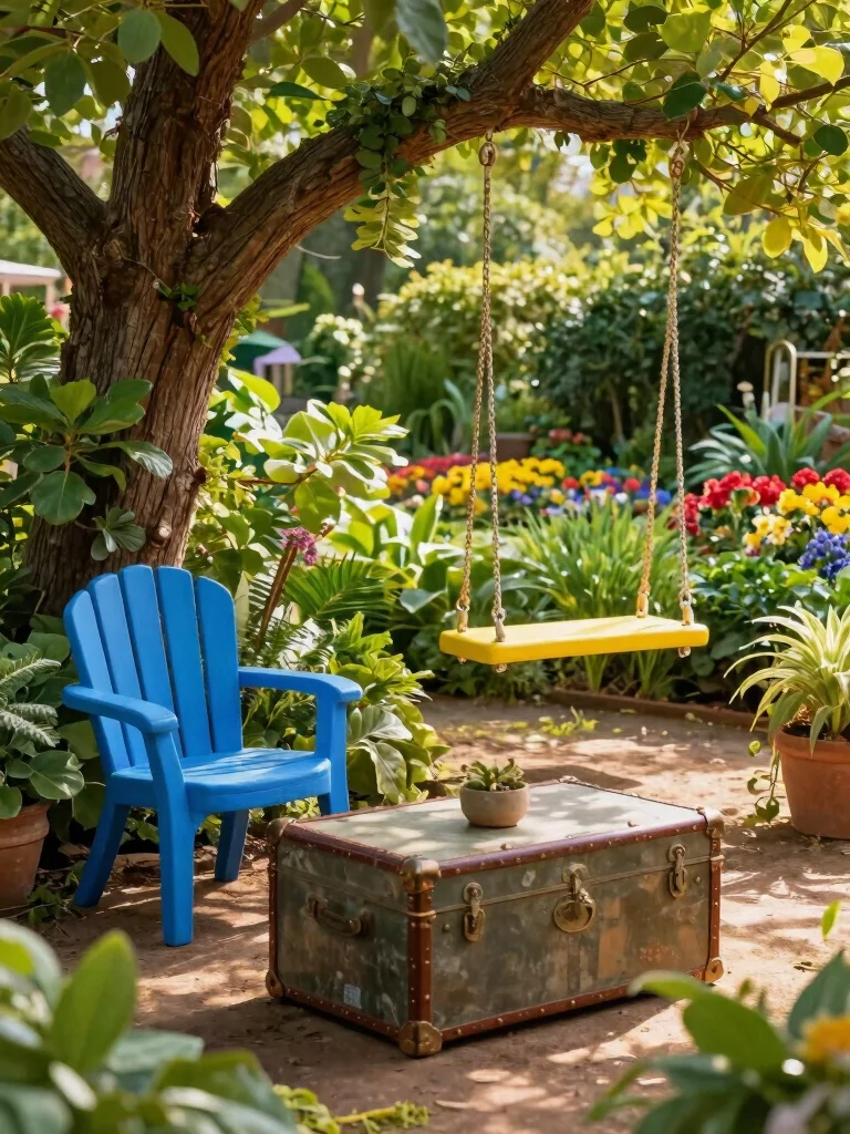 Look for second-hand treasures you can refurbish with a coat of paint or fun cushions. Vintage pieces can serve as stunning focal points, like an old trunk as a coffee table or a colorful wheelbarrow transformed into a planter. Adding playful designs like swings or hammocks enhances relaxation and adds a touch of fun.