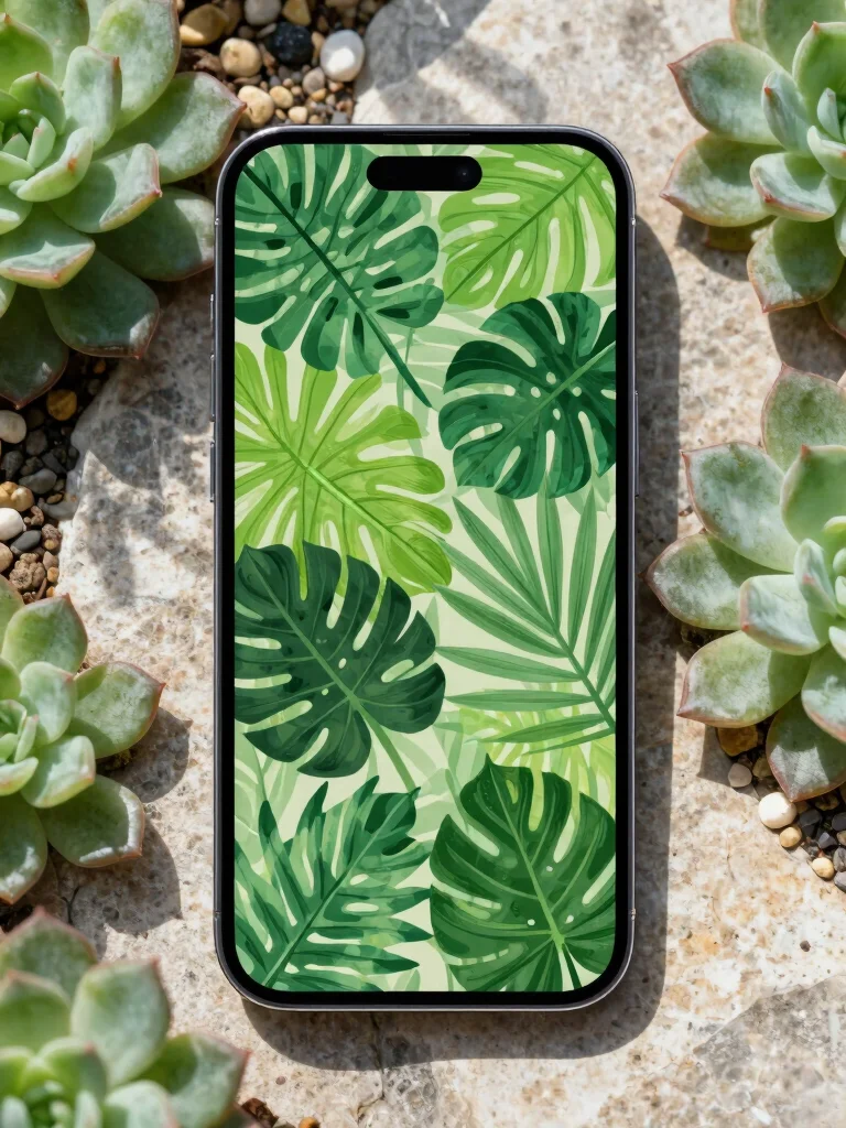 Transport yourself to a tropical paradise with a wallpaper featuring lush green leaves. This stunning design showcases a rich variety of illustrated leaves, each boasting intricate details and varying shades of green. The depth and texture create a dynamic and vibrant backdrop that resonates with nature lovers. Perfect for those seeking tranquility, this wallpaper serves as a calming presence while adding sophistication to your device.