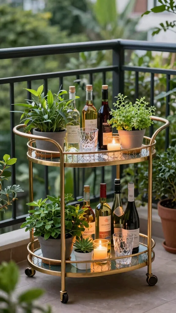 Your chic bar cart adds elegance to your balcony, creating a perfect spot for entertaining.