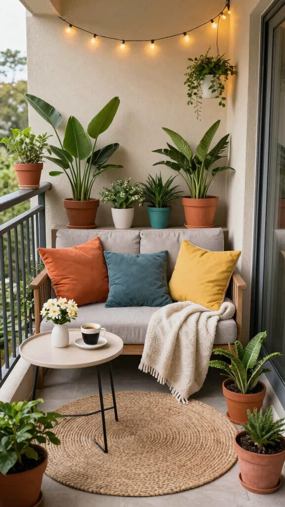 Use a compact seating arrangement and weatherproof cushions to feel like a real room, not just a balcony.