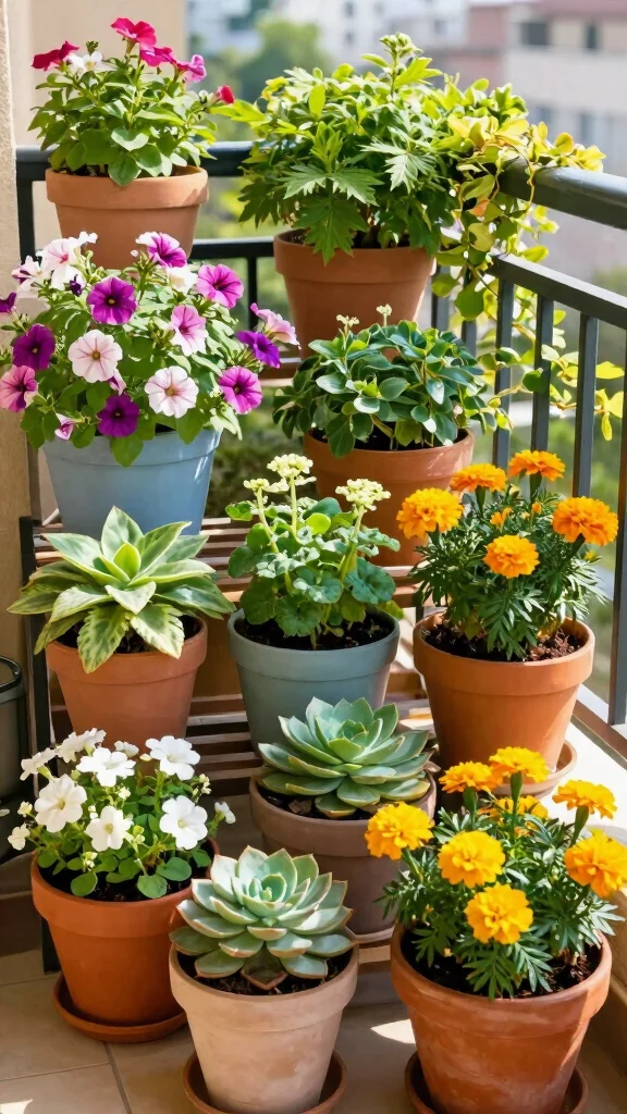 Colorful container arrangements show a tiny balcony can feel like a joyful retreat. Mix bold colors and varied pot heights, and your apartment garden balcony becomes a lively, relaxing oasis you actually want to use.