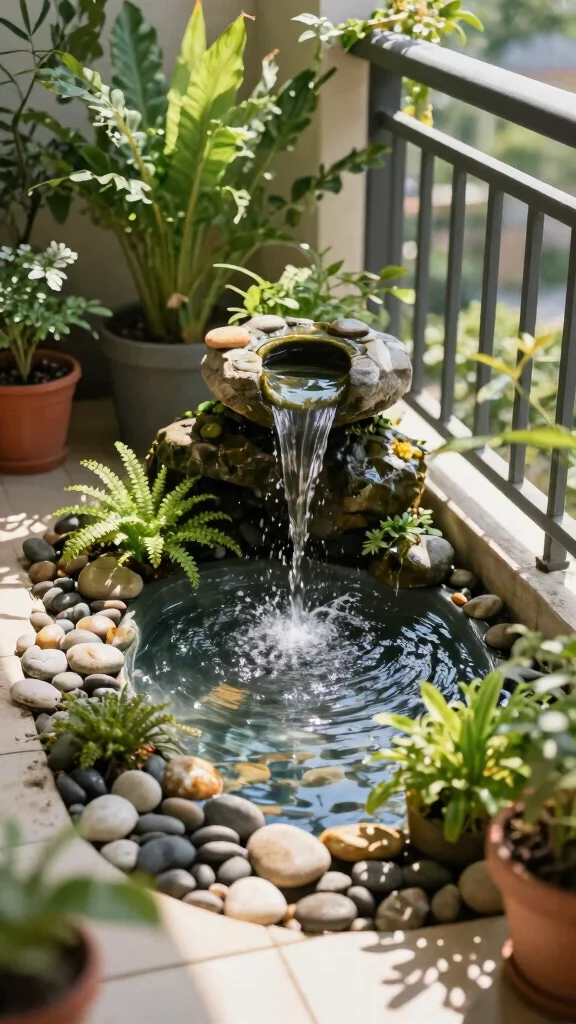 Introduce a sense of tranquility to your balcony with a small water feature. A tabletop fountain or miniature pond creates a soothing environment, perfect for unwinding after a hectic day. The gentle sound of flowing water not only calms your mind but also attracts birds, enhancing the liveliness of your outdoor space.