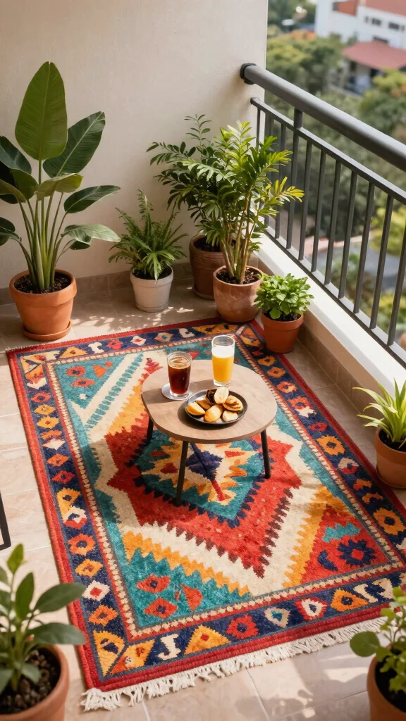 Enhance your balcony’s charm with outdoor rugs that add warmth and style. These rugs create a cozy atmosphere, making your space feel like an inviting extension of your living area. Choosing weather-resistant materials ensures they stand up to the elements while enhancing your decor.