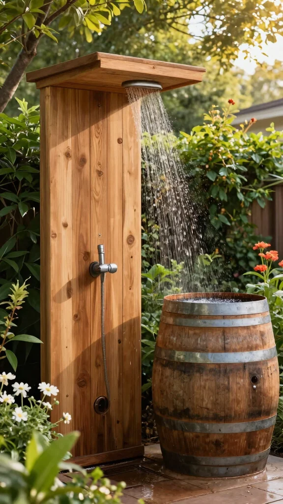 Fun fact: A simple rain barrel can supply up to 2,000 gallons per season for outdoor showers, a smart addition among backyard oasis ideas. Pair it with natural materials and plants for a private, refreshing oasis.