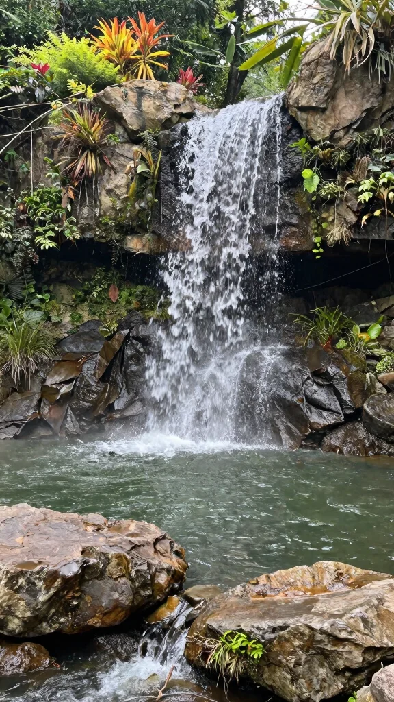 Design the waterfall using rocks and boulders to achieve a natural appearance. Surround it with plants to enhance beauty and add earthy charm. Include a pump with a timer to effectively manage the flow of water.