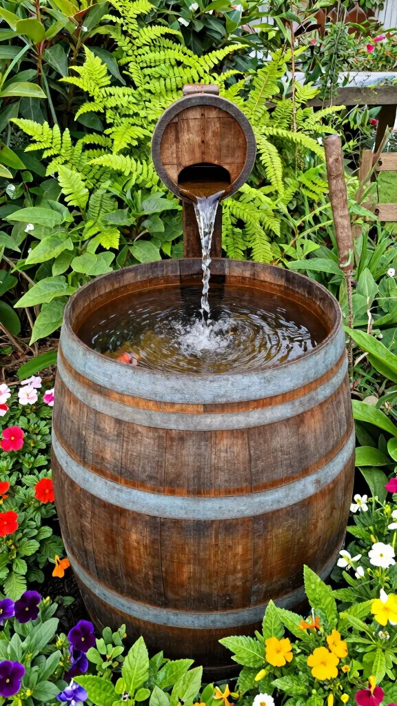 Capture and reuse rainwater with a decorative barrel or cistern to reduce water waste, and line the feature with natural stones that encourage wildlife. Plant native, drought-tolerant plants around the edge to filter runoff and create a lush look without extra watering.