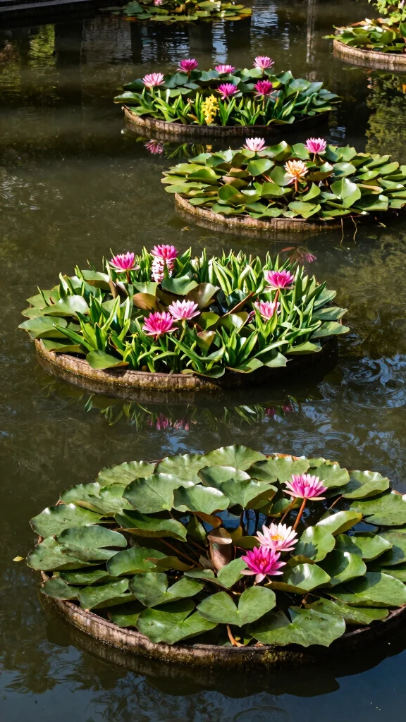 Floating plant shelves in a pond or water feature add a modern touch while supporting aquatic plants. These shelves allow plants to thrive, keeping the water clean and adding texture to the surface. Imagine the beauty of lush greenery floating gracefully on your water feature.