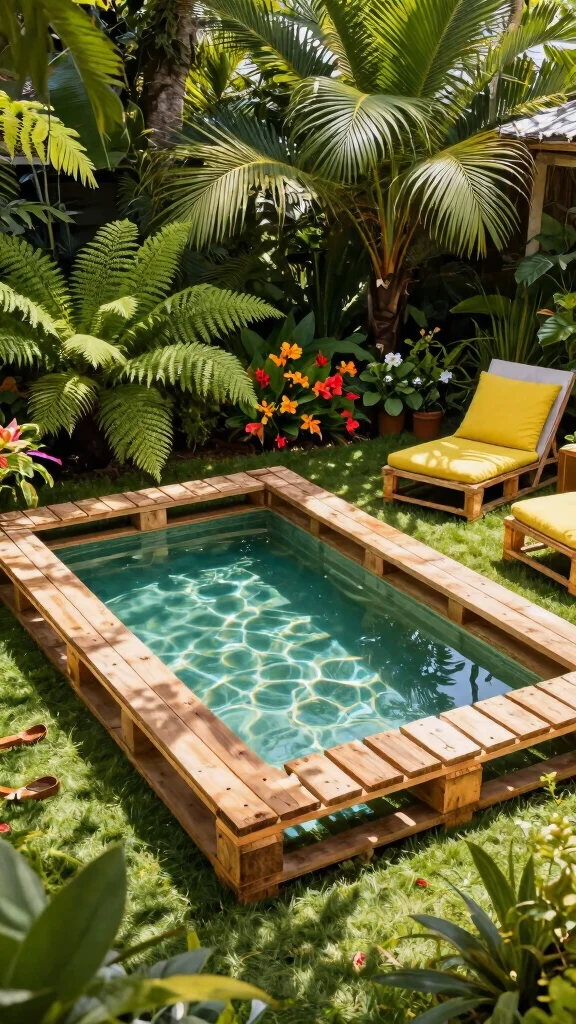 Use wooden pallets to create a stylish, budget-friendly pool that adds a tropical flair to your backyard oasis.