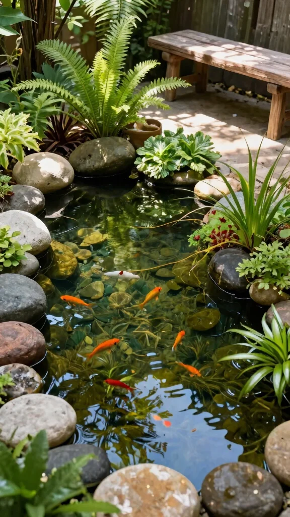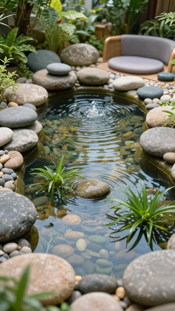 Mini Zen PondRocks, pebbles, aquatic plantsLow costTranquil, low maintenance