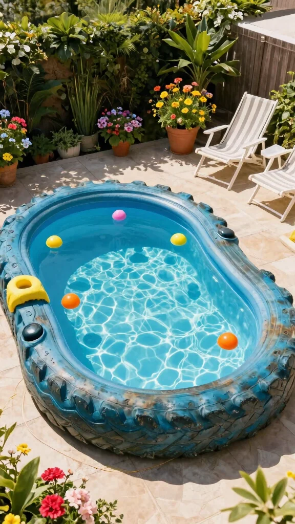Did you know repurposed tires can slash pool setup costs by up to 60%? Stack them creatively for a backyard oasis on a budget pools vibe and eco-friendly charm. Add a waterproof liner and colorful floating toys to make it instantly playful.