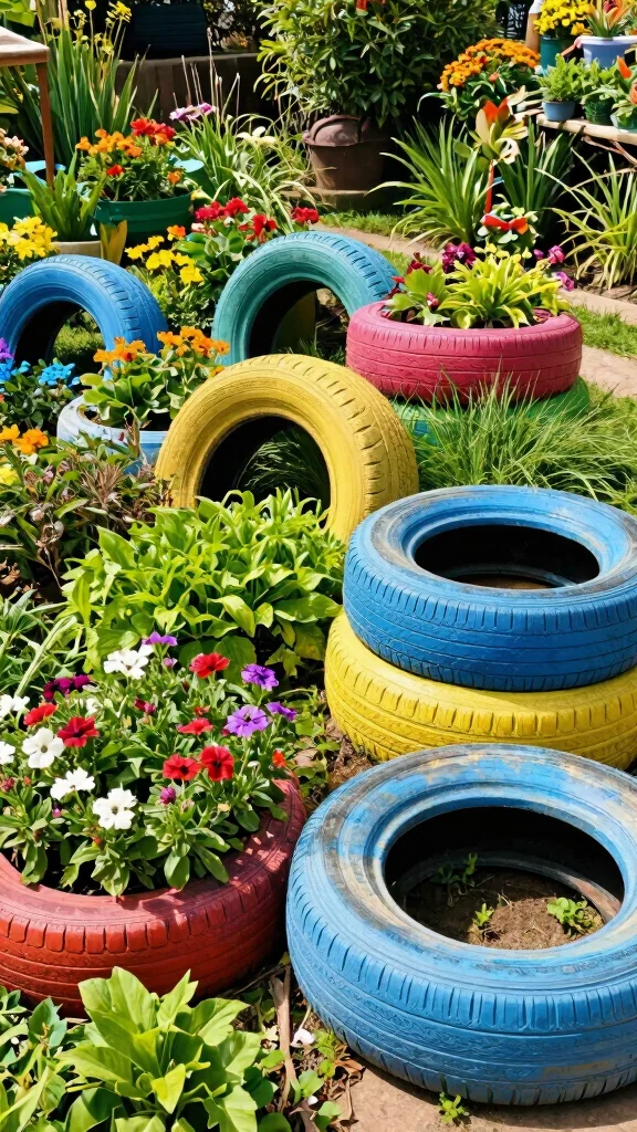 Transforming old tires into planters not only gives them a new life but also adds a quirky touch to your garden. This fun and budget-friendly idea can be personalized by painting the tires in bright colors or patterns, filling them with your favorite plants or flowers. It’s a creative way to repurpose materials while enhancing your garden’s charm.Start by cleaning the tires thoroughly and removing any debris, then paint them with outdoor-safe paint for added flair. Fill the tires with potting soil and your choice of plants for a unique and cheerful garden feature. Arrange them creatively to make a statement in your outdoor space.Steps to Create Tire Planters:
