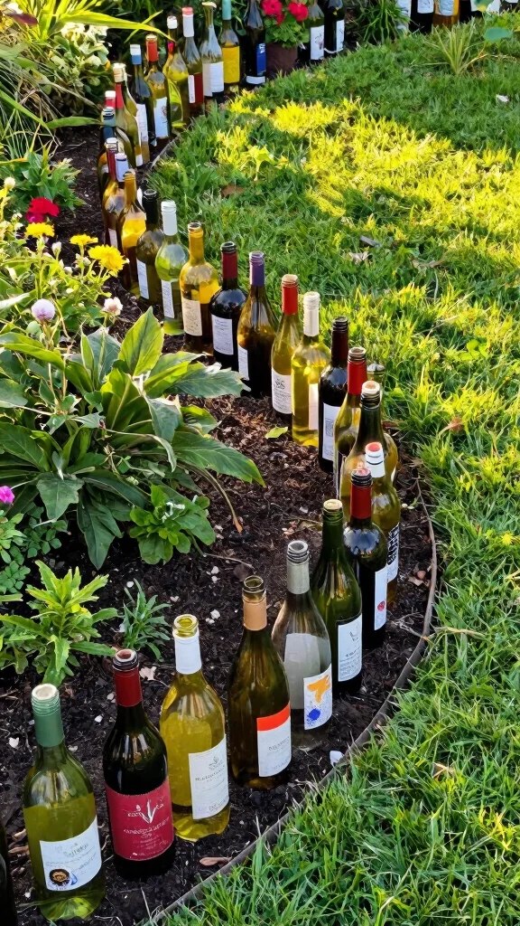 Repurpose old wine bottles as decorative garden edging, providing a unique look without spending much.