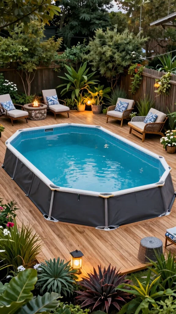 Imagine lounging by an above ground pool surrounded by warm, natural wood decking. This setup not only blends beautifully with nature but also creates a cozy retreat for you and your guests. Pair the deck with low-maintenance native plants for a sustainable and beautiful landscape. Add some inviting seating with colorful outdoor cushions and consider a fire pit nearby for those relaxing evenings. Use eco-friendly solar-powered lanterns to brighten the space at night, enhancing the inviting atmosphere even further.