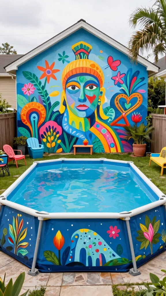 Infuse your backyard with artistic flair by choosing a vibrant mural as a backdrop for your above ground pool. Select a design that reflects your personality, whether it’s tropical scenes, abstract art, or nature-inspired prints. Surround the pool with colorful garden accessories and furniture that mirror the mural’s hues, creating a cohesive and inspiring atmosphere.