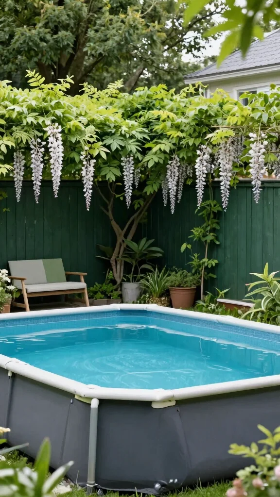 Enhance your backyard oasis with green fencing around your above ground pool, providing privacy and a lush backdrop. Use climbing plants like wisteria or jasmine to cover trellises or wooden fencing, allowing nature to soften the structure and create a beautiful green wall effect.