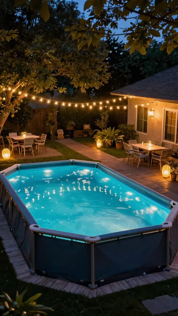Illuminate your backyard oasis with thoughtful lighting that creates a warm and inviting atmosphere around your above ground pool. Incorporate string lights or lanterns draped from trees or a pergola for an enchanting touch. Use underwater pool lights to softly illuminate the water, avoiding harsh glare.