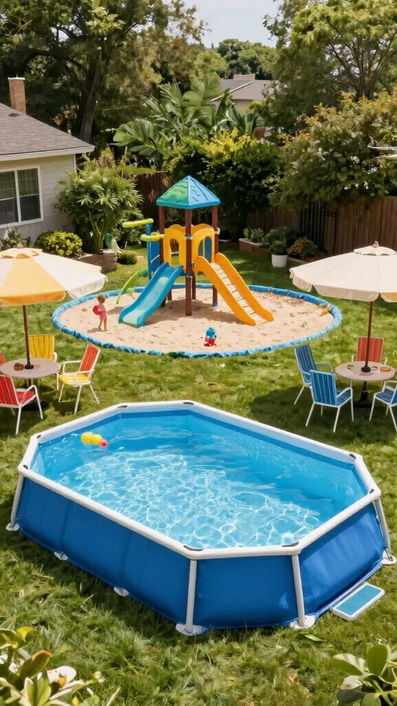 Design a vibrant family-friendly backyard oasis centered around an above ground pool. Surround it with durable, colorful furniture that caters to both kids and adults. Create a small play area with a sandbox or climbing frame nearby, ensuring the little ones have plenty to do. Include shaded spots with umbrellas or a large sail to protect against the sun, and prioritize safety with features like a removable fence or pool cover.
