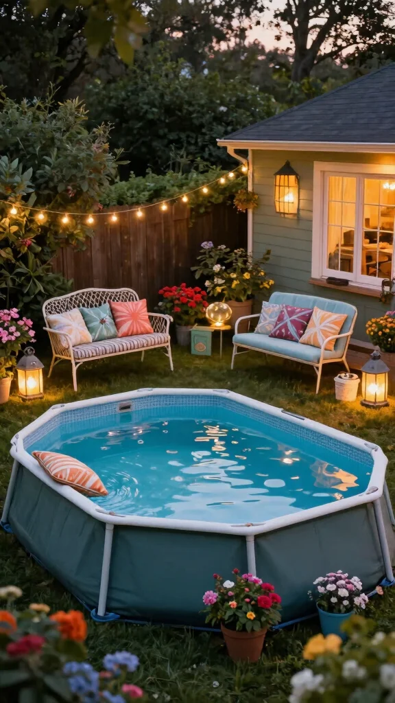 Bring a charming cottage feel to your backyard by surrounding your above ground pool with whimsical decor and soft pastel colors. Use vintage-style furniture and colorful cushions to create inviting seating areas, perfect for relaxing. Plant flowering shrubs and climbing roses to add fragrance and beauty to the space, enhancing the cozy atmosphere.