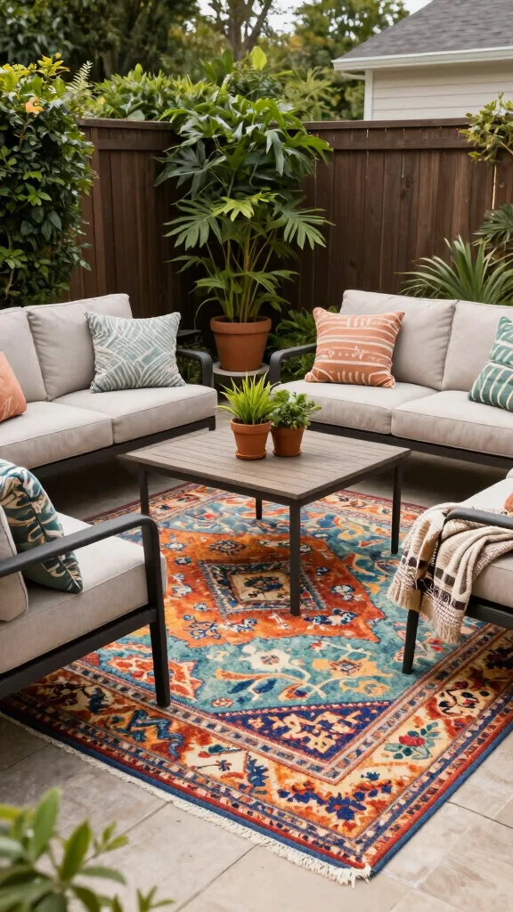 Outdoor RugsDefines seating areaChoose weather-resistant materials