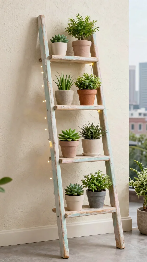 When building your plant ladder, select sturdy wood for durability. You can paint or stain it to match your balcony’s aesthetic, and adjustable shelves will allow for various pot sizes. Arranging taller plants at the bottom and smaller ones on top creates a beautiful cascading effect.