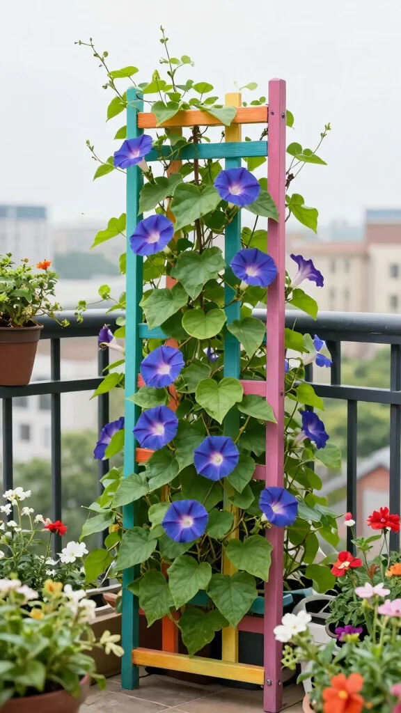 A trellis can serve as an exquisite focal point for climbing plants on your balcony. By using a colorful trellis, you enhance the visual appeal while allowing plants like morning glory or jasmine to flourish. Positioning your trellis against a wall adds height to your garden, creating an illusion of more space.