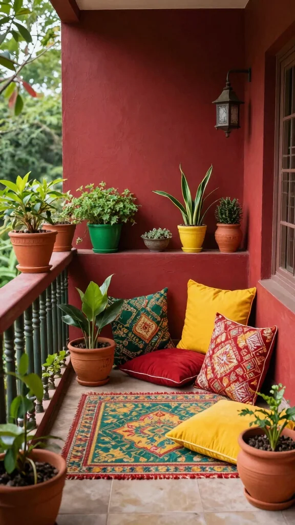 A cohesive color scheme can beautifully unify your balcony garden. Select pots, plants, and decor items that complement one another for a harmonious look. For an Indian theme, consider deep reds, greens, and yellows that resonate with traditional decor, elevating your balcony’s overall aesthetic.