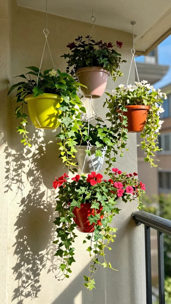 Utilize vertical space creatively with hanging gardens, a fantastic way to add greenery without sacrificing floor space. Use hooks to suspend pots from the ceiling or create stair-like arrangements on walls to save room. Flowers like petunias or trailing plants like ivy work beautifully in this setup, making your balcony feel more spacious while adding depth to your garden.