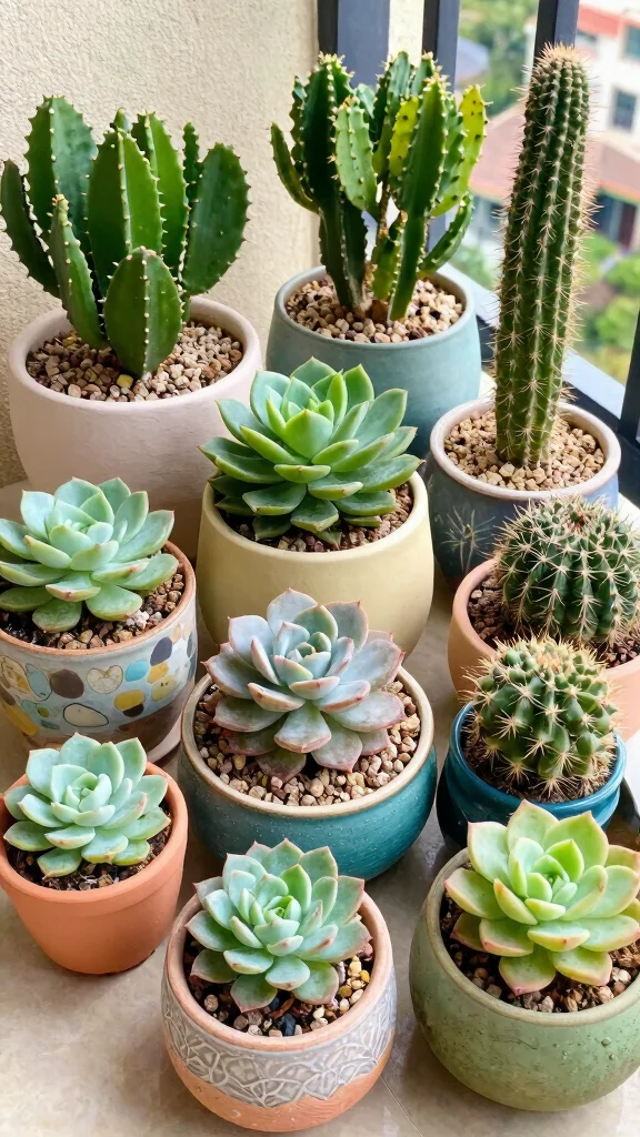 Transform your balcony into a low-maintenance paradise with a collection of succulents and cacti. These hardy plants are perfect for busy urban dwellers, requiring minimal care while adding a touch of greenery. Use decorative pots of varying sizes to create a visually appealing arrangement, featuring types like jade plants, aloe vera, and various cacti for a lively display.