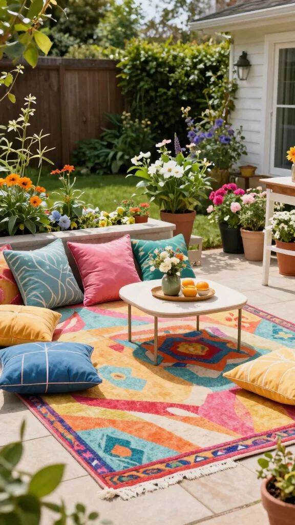 Patio rugs can instantly enhance your outdoor seating area, making it feel welcoming and cozy. Adding a splash of color under your furniture creates an inviting vibe that brings your space to life. You can find affordable outdoor rugs at many retailers or even create your own using a stenciling technique on drop cloths.