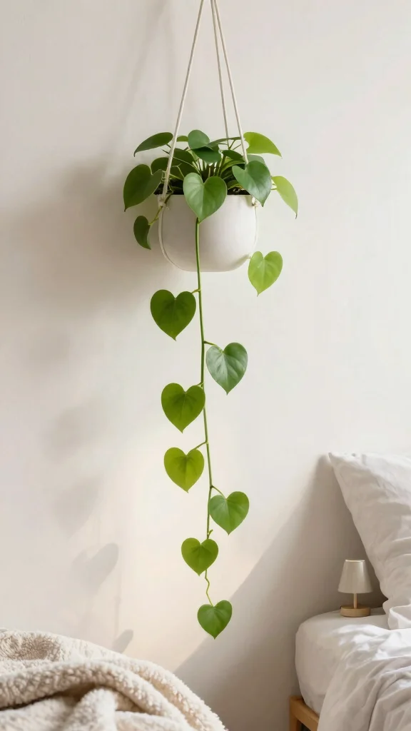 For bedrooms with limited natural light, pick forgiving hanging plants like pothos (Epipremnum aureum) and heartleaf philodendron (Philodendron hederaceum). Both thrive in indirect light and trail beautifully, adding greenery without clutter. A spider plant (Chlorophytum comosum) is another easy option that tolerates low to moderate light. Water when the top inch of soil dries, use a well-draining mix, and avoid overwatering. If your room has bright artificial light, you can also try string of hearts or small ferns, but place them where they’ll get enough light. Rotate plants every few weeks to keep growth even. These low-light tolerant hanging plants help create bedroom greenery and a cozy indoor plant decor vibe.