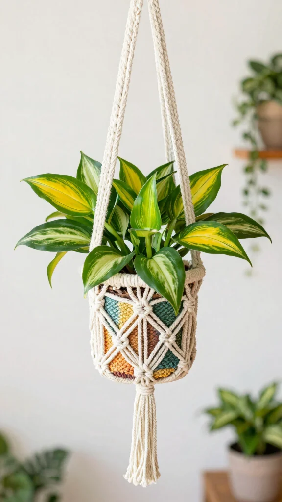– Use a colorful macramé hanger for added flair