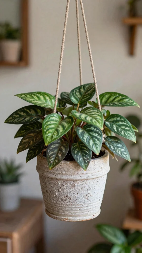 Water it when the top inch of soil is dry, avoiding overwatering. This plant is perfect for living rooms or cozy corners, and a simple hanging pot allows its lovely leaves to shine.