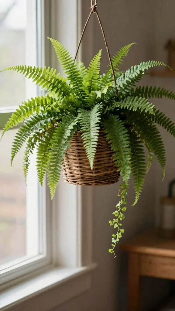 Keep your ferns happy by maintaining consistently moist soil and misting them regularly to boost humidity. They do well in filtered sunlight or low-light areas. Consider hanging them in a decorative woven basket for a boho aesthetic.