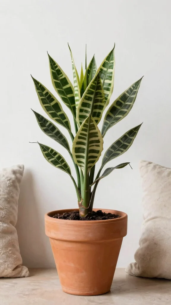 Water your Zebra plant only when the soil is fully dry to prevent root rot. It’s best placed in well-lit areas, such as near windows, and using a simple terracotta pot emphasizes its striking appearance.