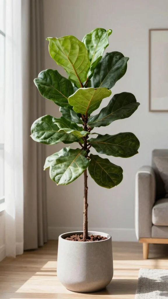 To keep your Fiddle Leaf Fig healthy, water it when the top inch of soil is dry, being careful to avoid overwatering. Rotating the plant occasionally ensures even growth and keeps it looking its best. A modern pot can enhance its stylish aesthetic, perfectly complementing its dramatic leaves.