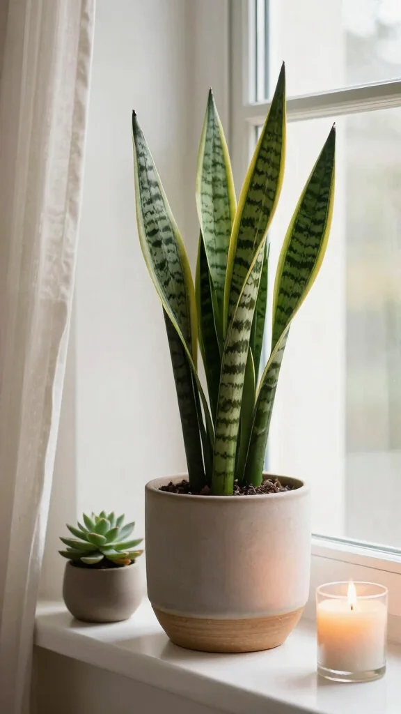 The snake plant, often celebrated for its resilience, thrives in low-light settings while adding a striking visual to your windowsill. Its tall, upright leaves bring both height and texture, creating a beautiful focal point that enhances your home’s aesthetic. This hardy houseplant not only decorates your space but also purifies the air, making it a dual-purpose addition to your decor.