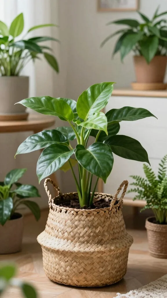 For an appealing display, opt for a textured pot that complements the room’s design. Pair the peace lily with other plants of varying heights to create a lush, layered look that draws the eye.