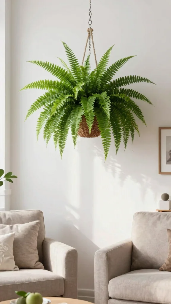 Boston ferns are known for their feathery foliage and air-purifying abilities. Hanging one in a basket can create an enchanting effect in your living room, adding softness and a natural element to your decor. Placing it near a window allows it to receive filtered light, ensuring it thrives and maintains its lush appearance.